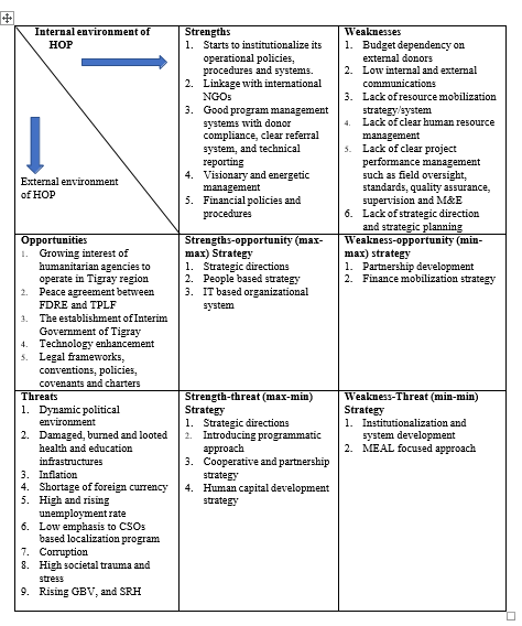 In order to identify critical issues that this strategic plan needs to deal with formulation of HOP’s future strategic directions, the strategic planning team has been engaged in analyzing HOP’s external and internal environment. Situational analysis is conducted internally by analyzing HOP’s strengths and weakness. Externally, by analyzing HOP’s external opportunities and Threats. We call this SWOT Analysis. Furthermore, macro environment analysis where the political, economic, social, technological, legal and environmental issues are also analyzed and interpreted. We call this PESTLE analysis. Therefore, scanning the environment using the SWOT and PESTLE analysis finally resulted in the following matrix. The matrix helps in identifying future strategic directions by maximize our strengths and opportunities and minimize our weaknesses and threats.
