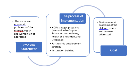 An organization’s Theory of Change describes how it believes it makes a difference and it is a logical sequence of steps expected to lead to a desired outcome. It is also a way of thinking about and planning for change. Therefore, HOP’s theory of change describes how HOP’s strategic plan is approached and implemented. HOP’s theory of change is focused on how our target beneficiaries the children, youth and women are benefited from our programs of humanitarian support, education and training, health and nutrition and livelihood and consequently addresses their socioeconomic problems.