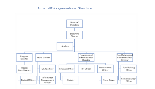 HOP conducted Organizational Capacity Assessment Tool (OCAT) which assisted it assess the critical elements for its effective organizational management, and identify areas that need strengthening or further development. This assessment helped us to develop concrete action plans to provide HOP with a clear organizational development roadmap. Finally, HOP developed an organizational structure that defines the vertical and horizontal relationship among every operational departments that will exist in HOP’s operation and more inclusive one to include organizational units that are likely to exist elsewhere in Tigray, Addis Ababa Liaison office, Somalia, Gambelia and Afar.