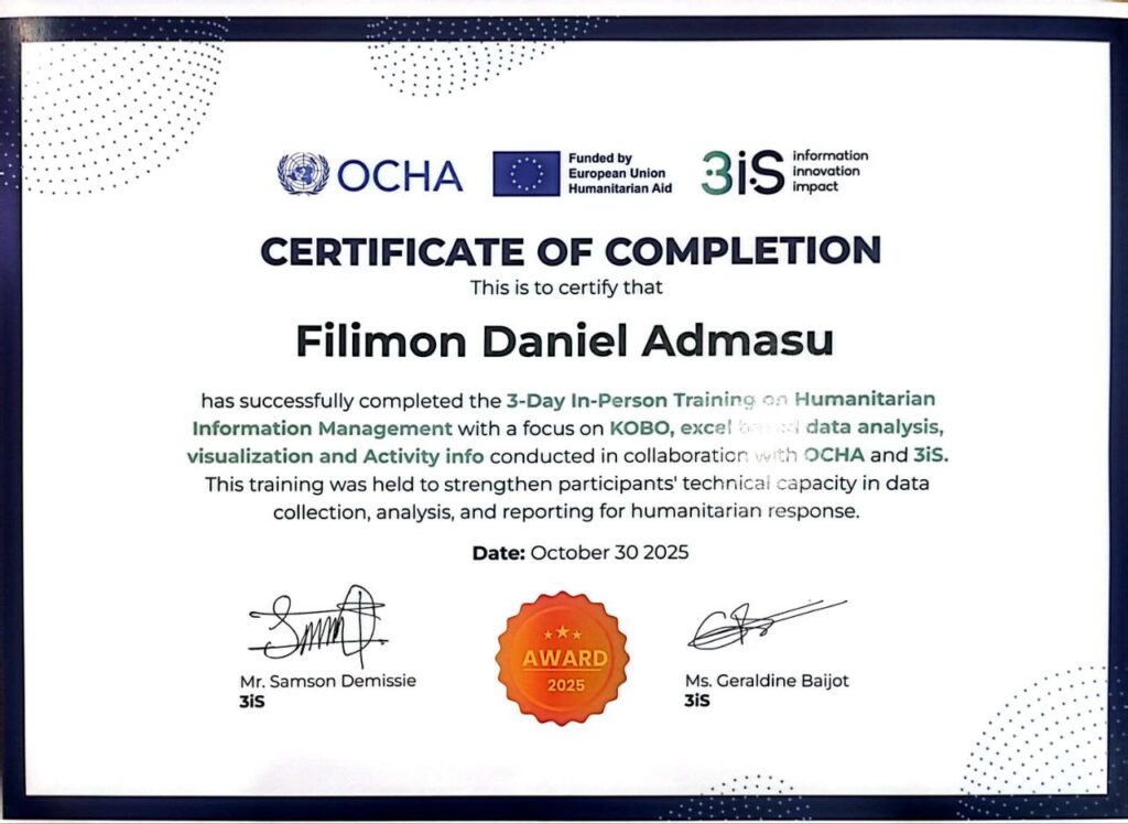 HOP was proudly represented by Flimon Daniel, Information Management Officer, at a three-day training on Activity Info reporting and data integration, held from 28–30 October 2025 at the Grand Palace Hotel in Addis Ababa. The training was organized by 3iSolution (3iS) in collaboration with the Ethiopia Humanitarian Fund (EHF).